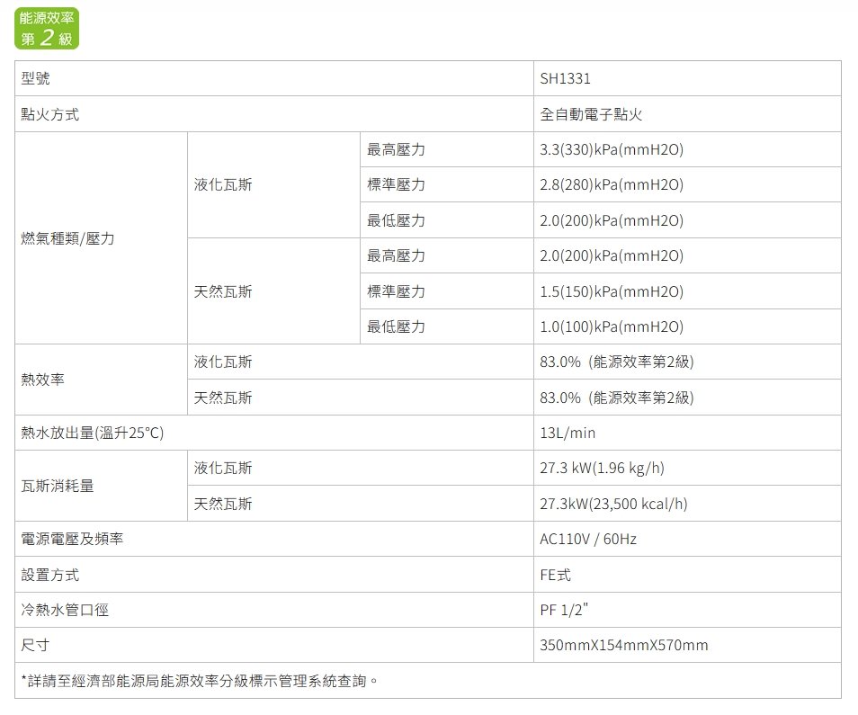 燃氣種類/壓力(液化瓦斯):標準2.8 kPa