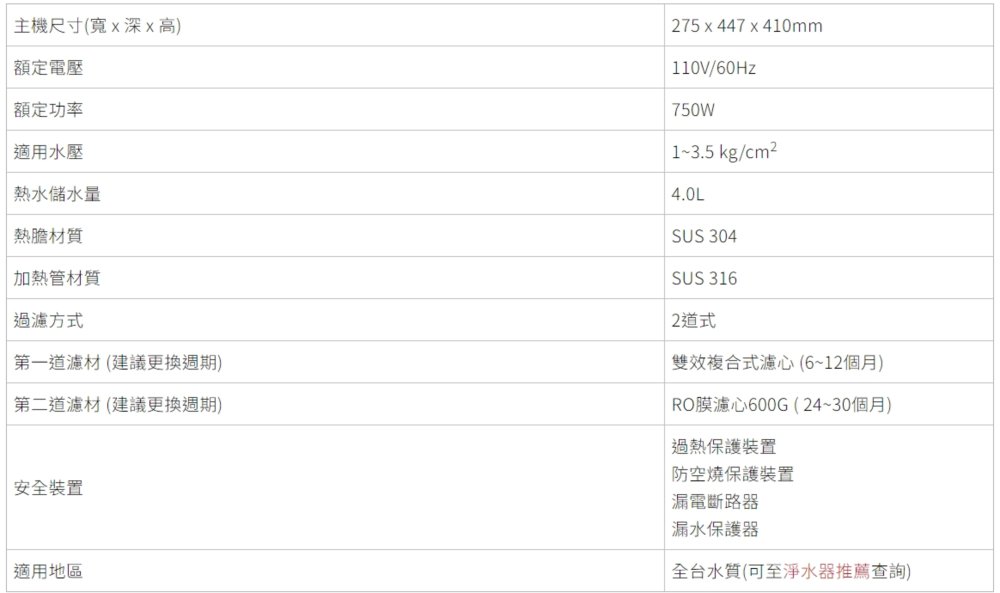 過濾濾材:第一道-雙效複合式濾心 (6~12個月)/ 第二道-RO膜濾心600G ( 24~30個月)