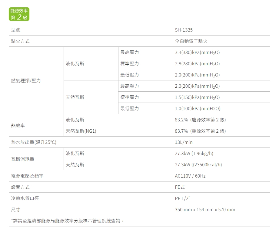 燃氣種類/壓力(天然瓦斯):標準1.5 kPa